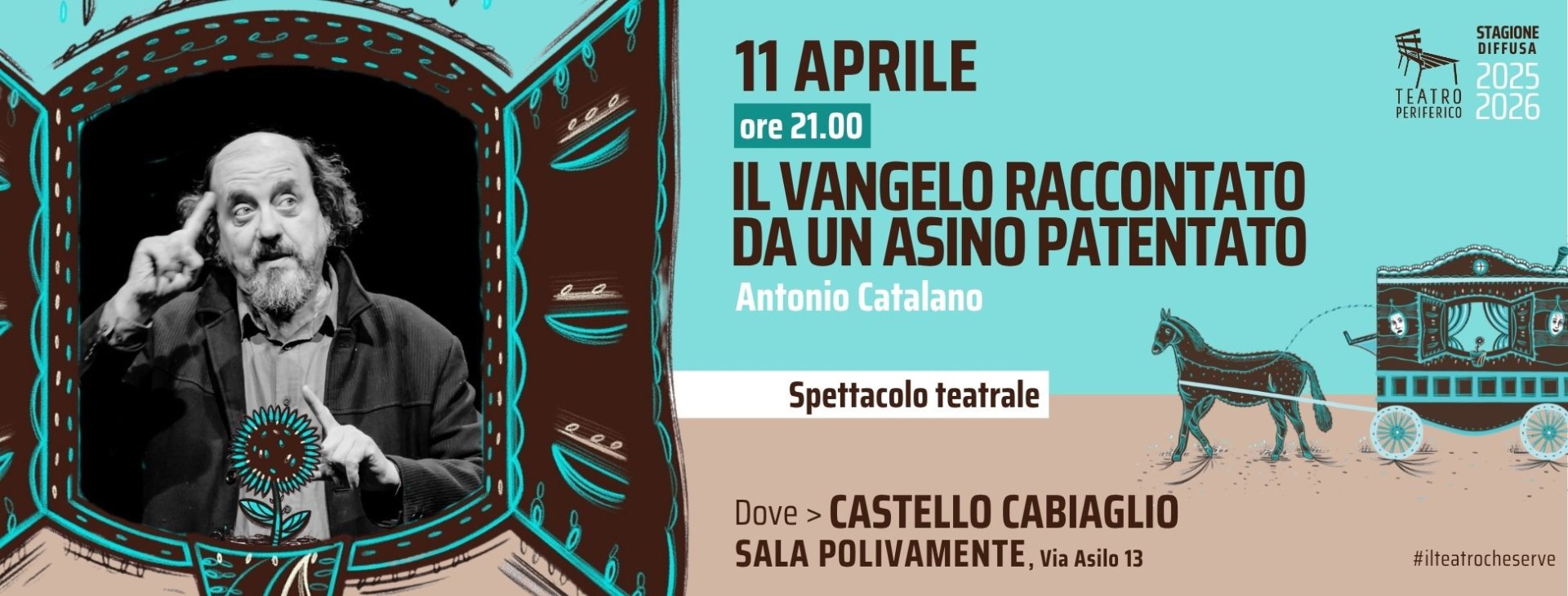 “LATITUDINI 25.26”, la stagione diffusa del Teatro Periferico di Cassano Valcuvia, arriva a Castello Cabiaglio con la poesia e la meraviglia dell'eclettico artista Antonio Catalano, che sabato 11 aprile alle 21.00 porta sul palcoscenico della Sala Polivalente “Il Vangelo raccontato da un asino patentato”.